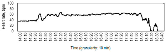 A single recorded molting was preceded by rapid heart rate fluctuations. The increase in heart rate was observed four hours before the molting, up to 60 bpm with the peak of 72 bpm, and the heart rate decline was detected 35 min before molting (Figure 1). Kuramoto [24] described the cardiac changes of untreated spiny lobster Panulirus japonicus before the molting and noted that the heart rate rose and fell during molting of lobster similarly to that of crayfish. The heart rate of an unaffected lobster increased 1–2 h before ecdysis to a peak of 80–120 bpm and declined about 15 min before the beginning of molting. Thus, the changes in the heart rate of unstimulated spiny lobster and the ClO2 exposed signal crayfish were similar in the premolting period.