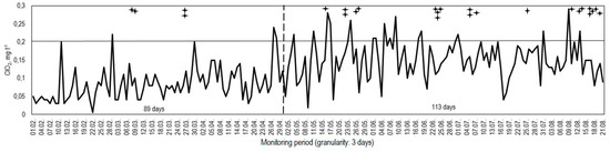) indicate crayfish mortalities; the fluctuating line indicates levels of ClO2 concentration; the solid horizontal line indicates level of ClO2 concentration 0.2 mg L−1; the punctuated vertical line divides exposure period in two parts: First period (89 days), when high ClO2 concentrations (up to 0.2 mg L−1) were found five times and four crayfish died; and the second period (113 days), when high ClO2 concentrations occurred 23 times and 21 crayfish died.