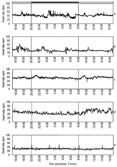 The heart rate daily cycle of 32% of crayfish was already disturbed at a lower level of ClO2 concentration (less than 0.2 mg L−1). A prevalence of disrupted heart rate was observed, with chaotic increases and decreases regardless of the time of day. There was no statistical difference between day and night cardiac activities within the tested groups (Table 2) as well as between groups (day: F(2,22) = 0.80780, p = 0.45863 and night: F(2,22) = 1.5974, p = 0.22503). The diurnal rhythm was disrupted, and cardiac rhythmicity was lost. This was expressed in different heart rate fluctuations of animals exposed to the same concentrations of ClO2 (Figure 3).