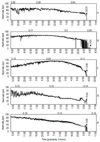 Examples of heart rate of five crayfish P. leniusculus two days before mortality occurred. The line indicates heart rate in beats per minute. Daily ClO2 (mg L−1) concentration are situated above the graphs, time of death is indicated by the vertical arrow.