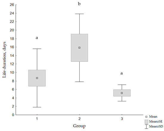 Life duration after Cmax exposure of crayfish three experimental groups: Group one got Cmax on day 4 ± 2; Group two on day 13 ± 1; and Group three was exposed to Cmax on day 38 ± 6. Life duration was: 9 ± 7 days, 16 ± 8 days, and 5 ± 2 days, respectively. There was a significant difference (p < 0.05) in life duration between groups: Individuals from Group two in general lived more than twice as long as crayfish from Groups one and three after exposure to Cmax.