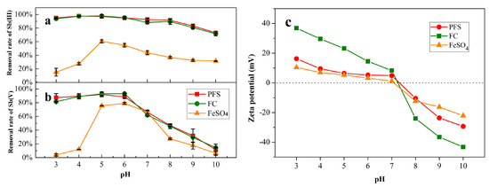 Effects of pH on (a) Sb(III) and (b) Sb(V) removal with 10 mg·L−1 of PFS, FC, and FeSO4 (initial Sb(III) and Sb(V) concentrations: 200 μg·L−1). (c) Zeta potential of PFS, FC, and FeSO4 (PFS, FC, and FeSO4 concentrations: 30 mg·L−1 as Fe). PFS: polymeric ferric sulfate; FC: ferric chloride.