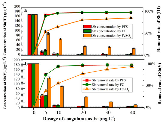 Effects of concentrations of coagulants on the removal of (a) Sb(III) and (b) Sb(V) by using PFS, FC, and FeSO4 respectively (initial concentration of Sb(III):176 μg·L−1; Sb(V): 185 μg·L−1).