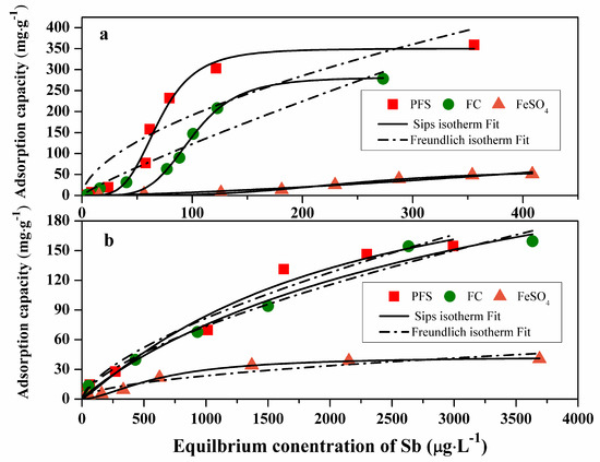 Coagulation of (a) Sb(III) and (b) Sb(V) by PFS, FC, and FeSO4 fitted with Freundlich and Sips isotherms (dosage of coagulants as Fe: 10 mg·L−1).