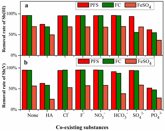 In a natural aqueous system, many constitutes may affect the removal of Sb, such as HA and anions [16]. The HA is connected with many functional groups, such as carboxyl and hydroxyl groups, which commonly exist in the natural environment. Figure 4 shows the effects of HA, Cl−, F−, NO3−, HCO3−, SO42−, and PO43− on the removal of Sb by coagulation with FPS. In the presence of Cl−, F−, NO3−, and SO42−, the effects on the removal rate of Sb by coagulation with 10 mg·L−1 of PFS were negligible. With the presence of HCO3−, the removal rate of Sb(V) by coagulation was slightly decreased because the hydrolysis of HCO3− decreased the pH of the solution and affected the removal of Sb(V). However, with the presence of PO43−, the removal of Sb(III) and Sb(V) was decreased remarkably, which was ascribed to the competition of adsorption sites between Sb and phosphate ions due to the similar tetrahedral structure and s2p3 outer electronic orbit [29]. HA also inhibited the removal of Sb(III) and Sb(V) remarkably. With the presence of HA, the removal rates of Sb(III) by using PFS, FC, and FeSO4 decreased by 21.01%, 27.13%, and 19.79%, respectively, and those of Sb(V) decreased by 31.67%, 36.10%, and 31.75% respectively. On the one hand, HA was competitive with Sb on the adsorption sites of coagulants. On the other hand, reactive functional groups of HA, such as phenolic and carboxylic acid, facilitated the combination of Sb and HA, which increased the solubility of Sb and hence inhibited the removal of Sb [16,18].