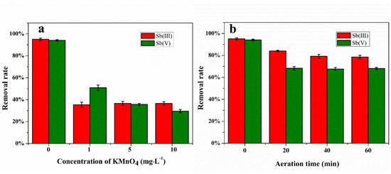 In a naturally aerobic environment, many oxidizing substances may oxidize Sb(III) to Sb(V), which affects the mobility and removal of Sb [25,30]. In this study, the effects of KMnO4 and aeration on the removal of Sb by coagulation with PFS of 10 mg·L−1 were investigated. Before coagulation, different concentrations of KMnO4 were applied for pre-oxidization, and the aeration process was conducted for different times.