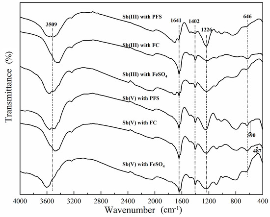 The combination of in situ formed HFO and Sb(III) or Sb(V) was investigated via FTIR spectra analysis (Figure 6). The spectral bands that appeared at around 3509 and 1641 cm−1 were attributed to the stretching and bending vibrations of -OH groups, respectively, for the adsorption of water on the surface of precipitates [31]. Peaks at 1402 cm−1 were ascribed to the bending vibrations of -OH groups connected to Sb and iron [32]. Peaks near 646 cm−1 were assigned to the Fe–OH bonds of precipitates, and the small shift of those bands was attributed to the adsorption of Sb(III) and Sb(V) [33]. The small peaks at 590 and 487 cm−1 of HFO-Sb(V), which were observed for the precipitates produced by coagulation of Sb(V) with PFS and FC, were due to the symmetric stretching and bending vibrations of Sb(V)–O bonds, respectively [32]. In addition, the Sb(V)–O bonds did not appear in the spectrum of precipitates produced by the coagulation of Sb(III), which indicates that no oxidation of Sb(III) appeared on the surface of iron hydrolytic precipitates.