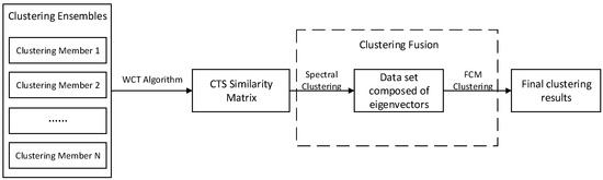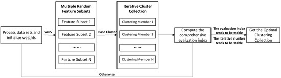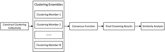 Cluster integration is mainly divided into two steps. The first step is to construct the cluster collective, and the second step is to design the consistency function. Then, how to construct a high-quality cluster collective based on small- and medium-sized watershed data sets has become the prerequisite for similarity analysis using cluster integration. After we obtain the cluster group, how to design a consistency function for them becomes the key to similarity analysis of that. For the characteristics of small and medium watershed data, this paper first proposes the constructing clustering ensembles by weighted random sampling (WRS-CCE) to obtain high quality clustering groups. Then combining Spectral Clustering (SC) with fuzzy C-means (FCM) clustering algorithm to get clustering results and the specific watershed similarity analysis can be performed. The clustering ensemble processes are shown in the Figure 1.