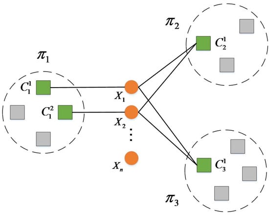 When the concept of Connected Triple is applied to clustering ensemble, it can be understood in conjunction with Figure 4. In Figure 4, denotes the th clustering member, represents the first th data. The superscript of denotes the label of the cluster, and the subscript denotes the label of the cluster members. That is, represents the th cluster of the th cluster member. If belongs to cluster , they are connected by a straight line.