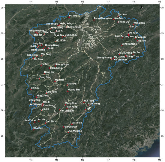 Distribution of 69 hydrological stations in Jiangxi Province.