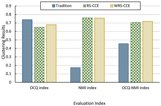 In the case of basic clustering using , the traditional clustering construction method, constructing clustering ensembles by random sampling (RS-CCE) and WRS-CCE are used to construct the clustering group, and several evaluation indicators are used to compare the clustering effects. The specific parameters are as follows: