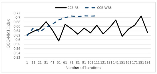 It can be seen from Figure 8 that the comprehensive index of the clustering ensemble generated by the RS-CCE algorithm will generate many peaks, and the fluctuations are very large. After iterations are repeated many times, it may still be in an unstable state. It is necessary to complete all iterations before ending the iteration, the clustering efficiency is low. The WRS-CCE algorithm achieves a large value and tends to be stable after the number of iterations reaches 100. The reason is that the algorithm quickly ends the iteration by dynamically updating the feature index weights and reducing the probability that the feature indicators that have bad effects on the cluster are selected. Therefore, it can be concluded that the clustering efficiency of WRS-CCE is much higher than that of RS-CCE.