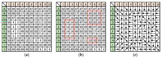 HUD-DC implements ArcGIS-based surface delineation to reveal the hydrologic connectivity at a watershed scale by identifying a series of HUs, including PBUs and CBUs, and provides topographic information related to depressions and channels for hydrologic modeling in depression-dominated watersheds. Following Chu et al. [] and Tahmasebi Nasab et al. [], a PBU consists of a highest-level depression and its contributing area, while a CBU includes a channel segment and its contributing area. Moreover, one highest-level depression may have a number of embedded lower-level depressions. Since a PBU does not contribute water to its downstream HU(s) (PBU or CBU) until the highest-level depression of the PBU is fully filled and the focus of HUD-DC is on the surface delineation at a watershed scale, the dynamic merging and splitting of lower-level depressions within a PBU are not taken into account in HUD-DC. Compared with Arc Hydro, HUD-DC considers both depressions and channels when identifying contributing areas and provides the detailed connectivity between HUs. Similarly to the D-cubed algorithm, HUD-DC delineates a surface into numerous HUs (PBUs and CBUs) and determines their relationships and connectivity. However, instead of searching for depressions at all levels, HUD-DC only identifies the highest-level depressions, and new approaches are used in HUD-DC for watershed-scale surface delineation. To illustrate the methodology of HUD-DC, an artificial surface with 10 × 10 DEM grids (Figure 1a) was used in this study. Figure 1b,c, respectively, show the fully filled DEM and the flow directions under a fully filled condition, both of which are utilized as input data of HUD-DC. The fully filled DEM was created by using the ArcGIS filling function, while the flow directions were determined by using the methods developed by Tarboton et al. [] and Jenson and Domingue []. HUD-DC consists of two major modules, depression identification module and channel and HU identification module. Their procedures are detailed in the following sections.