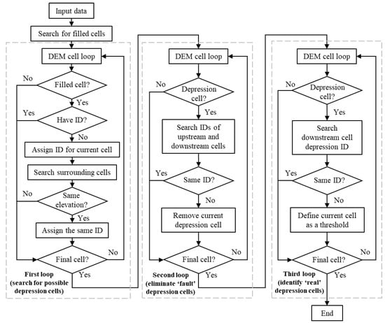 Figure 2 shows the flowchart of the depression identification module. The identification of depressions includes four major steps: (1) identification of the filled cells; (2) searching for possible depression cells; (3) elimination of ‘fault’ depression cells; and (4) identification of ‘real’ depression cells.