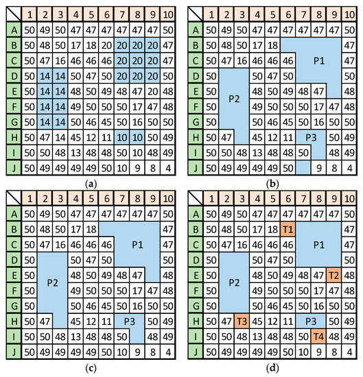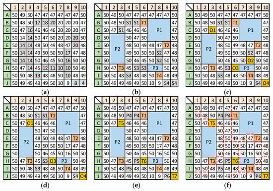 The channel and HU identification module was executed to identify channels, PBUs, CBUs, and the connectivity between HUs. The method proposed by Jenson and Domingue [] was used in this module to find channels in the fully filled condition, depending on a user-defined flow accumulation threshold and the flow directions (Figure 4). Figure 5a shows channel cells for the artificial surface (Figure 1a) when the flow accumulation threshold is set to 5. Note that the channel cells within depressions were removed by overlaying the channels and depressions (Figure 4), and the IDs of remaining channel cells were determined by using the ‘Stream Link’ function in ArcGIS. Figure 5b shows the cells identified for four channels. To identify PBUs and CBUs, it is required to find the ‘outlets’ of depressions and channels, which are depression thresholds and channel ending points. Since all depression thresholds were found in the depression identification module, only channel ending points were searched by using a cell loop after the identification of channel cells within depressions (Figure 4). If a cell belongs to one channel and this channel does not have an ending point, the cell is defined as the channel ending point. On the other hand, if the cell belongs to one channel that already has an ending point, the flow accumulation of the cell and the current ending point are compared and the cell with a higher flow accumulation is set as the new channel ending point. This loop continues until all channel cells are searched and identified. Following this cell loop, the ending points of the four channels are identified (i.e., O1-O4 in Figure 5c). Since HUD-DC focuses on the watershed-scale surface delineation, an optional procedure can be executed to eliminate short channels based on a user-defined channel length threshold (Figure 4). The criteria to delete a channel were: (1) the length of a channel is shorter than the user-defined length threshold, and (2) the flow direction at the ending point of the channel does not point toward the outside (i.e., the ending point is an outlet). In this study, channel ending points were considered in the calculation of channel lengths. For example, the length of channel S2 was 2 (Figure 5b). If the channel length threshold was 3, S2 was removed from the channel cells, and cells F8 and G8 in channel S2 were then assigned as contributing cells of P3 (Figure 5d). For S4, however, although its length is the same as that of S2 (i.e., 2), it is still considered as a channel because cell J10 is the final outlet of the entire surface (Figure 5d). After all channel ending points were finalized, a channel loop was performed to assign continuous IDs for the channels and their ending points that follow the IDs of the depressions and their thresholds, respectively (Figure 4). For example, channel S1 and channel ending point O1 were changed to P4 and T5, respectively (Figure 5e). The delineation of HUs is the final key procedure in the channel and HU identification module. HUD-DC employs the ‘Watershed’ function in ArcGIS to handle the delineation of HUs by considering the depression thresholds and the channel ending points as pour points (Figure 4 and Figure 5f). The IDs of the identified depressions and HUs were assigned to their associated HUs.