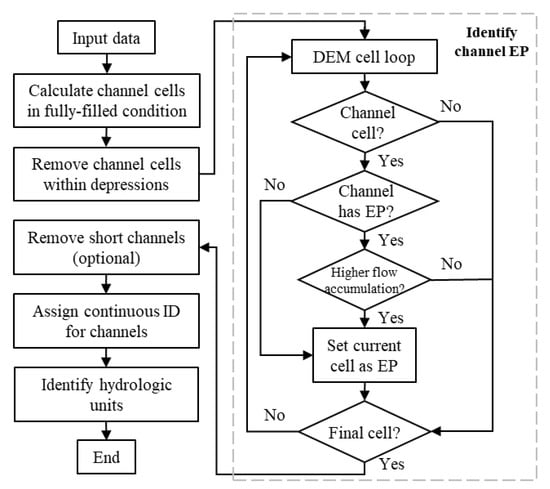 Flowchart of the channel and hydrologic unit (HU) identification module (EP: Ending point of a channel).