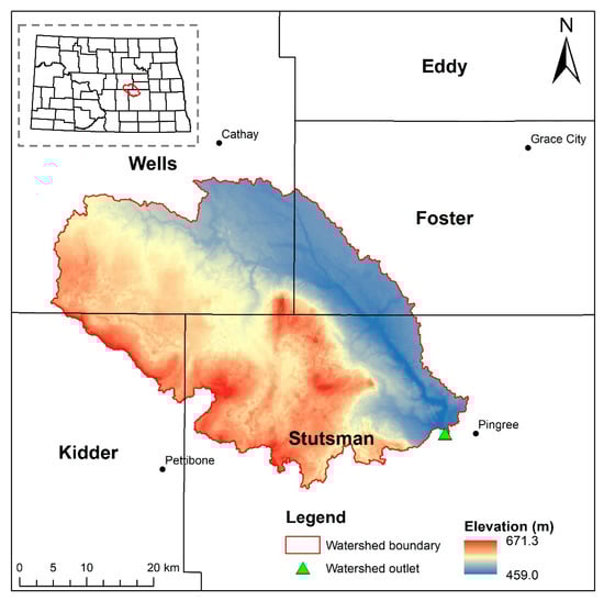 In this study, the Upper Pipestem Creek watershed in North Dakota (Figure 6) was selected to test the performance of HUD-DC in surface delineation. As the contributing area of the USGS 06469400 Pipestem creek gauge station (47°10′03″ N, 98°58′07″ W), the study area covers an area of 1668.12 km2, including parts of four counties in North Dakota (i.e., Wells, Foster, Kidder, and Stutsman counties) (Figure 6). Based on the 2011 NLCD (National Land Cover Database), the study area is mainly covered by cultivated crops (42.89%), herbaceous (26.01%), and pasture (14.81%). Moreover, the open water and emergent herbaceous wetlands account for 6.28% and 5.89%, respectively.