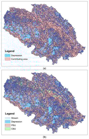 Figure 7a,b, respectively, shows the surface delineation results from Arc Hydro and HUD-DC based on the original DEM of the Upper Pipestem Creek watershed. For Arc Hydro, because channels were not considered in the ‘Depression Evaluation’ tool, only depressions and their associated contributing areas (CAs) were identified for the watershed (Figure 7a). Compared with Arc Hydro, HUD-DC extracted the channel drainage network of the watershed from the DEM (Figure 7b), identified CAs for all depressions and channels, and calculated the connectivity between HUs.