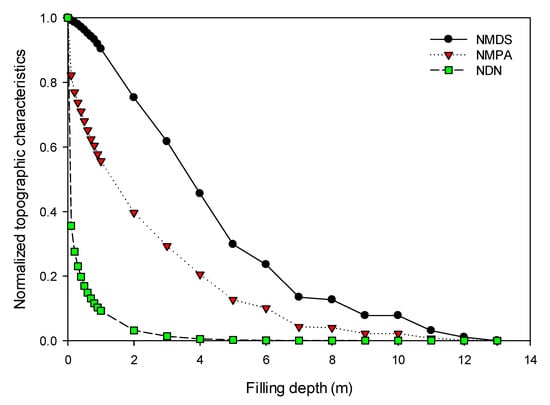 Variations of topographic characteristics with different filling depths. (NMDS: normalized maximum depression storage; NMPA: normalized maximum ponding area; NDN: normalized number of depressions).