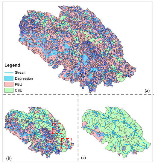 Spatial distributions of depressions and hydrologic units with the original DEM filled by a depth of (a) 0.1 m; (b) 1 m; and (c) 5 m. (PBU: puddle-based unit; CBU: channel-based unit; rectangle frames: PBUs that break the connectivity of CBUs).