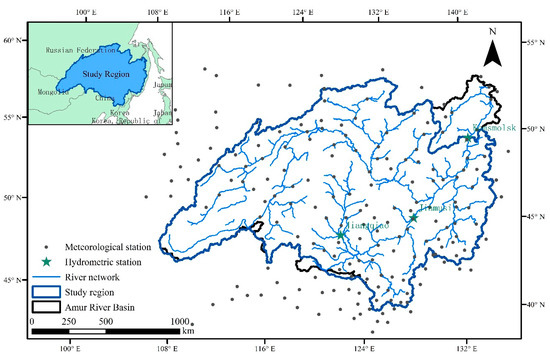 The geographic location of the study region (the Amur River Basin) showing the meteorological and hydrometric stations used in this study.