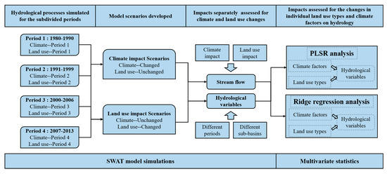 The impact analysis process consisted of four steps: Hydrological process simulations for the four periods, model scenario development, separate impact assessments for climatic variations, land-use changes, and impact assessments of changes in the individual land-use types and climatic factors on the hydrologic components, as shown in Figure 2. The first three tasks were dependent on the SWAT model simulation, and based on the separate impact modeling scenario results, the last task was completed using PLSR and RR to further assess the contributions of changes in individual land-use types and climatic factors to the hydrologic components. The methods used in this paper were introduced in more detail in the following subsections step by step.