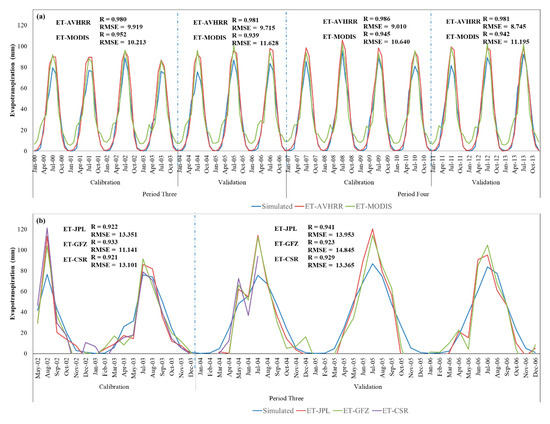 Model performance for the evapotranspiration (ET) data estimated from advanced very high-resolution radiometer (AVHRR), moderate resolution imaging spectroradiometer (MODIS) (a) and gravity recovery and climate experiment (GRACE) products (b) for the calibration and validation periods.