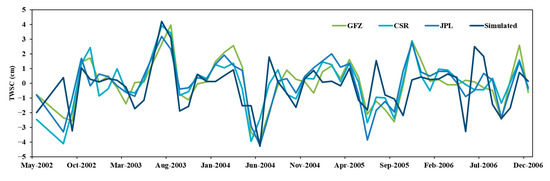 Inter-monthly average total water storage changes (TWSCs) of the study region derived from the SWAT simulation and GRACE products from May 2002 to December 2006.