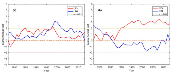 Sequential Mann–Kendall tests for the annual precipitation (a) and average temperature (b) with the forward-trend UFk and backward-trend UBk.