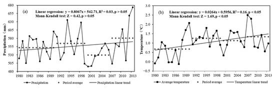 Annual precipitation (a) and annual average temperature (b) in the ARB, along with the trends and period averages of these data.