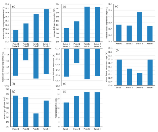 The variations in the eight climate factors during these four periods showed strong fluctuations and clear seasonal diversity. The average and extreme temperatures during the different seasons showed similar trends during the four periods. The summer average temperature and maximum temperature generally increased, while the average temperature and minimum temperature in winter changed greatly in Period 2 (the average temperature increased by 6.4% after 1990 based on a comparison between Period 1 and Period 2, and decreased by 8.1% after 2000 based on a comparison between Period 2 and Period 3). The precipitation in winter generally increased during the study period, whereas the SP exhibited a significant abrupt change after Period 2 (−10.7%), which was consistent with the trend analysis and abrupt change analysis results presented above.