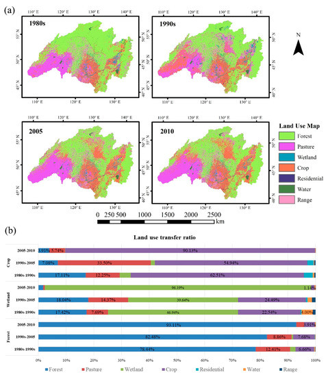 Land-use maps of the study region for each period and land-use transfer ratios of crops and wetlands between periods: (a) land-use maps and (b) land-use transfer ratios.