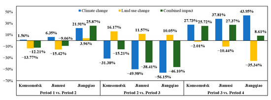 The impact analyses of 1980–1999 and 1991–2006 showed that the total runoff in the basin (Komsomolsk site) was greatly affected by the land-use (−13.77% based on a comparison between Period 1 and Period 2 and 16.17% based on a comparison between Period 2 and Period 3), and then the magnitude of the impact decreased (−2.01%) after 2007. At the Komsomolsk site, which was the outlet of the study region, the land-use changes and climate variability influenced the river runoff most strongly (16.17% and −31.38%, respectively) between the periods before and after 2000.