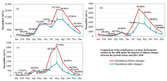 Comparison of the runoff process at three hydrometric stations in the ARB under the impacts of climate changes between the periods before and after 2000: (a) Komsomolsk station, (b) Jiamusi station, and (c) Jiangqiao station.