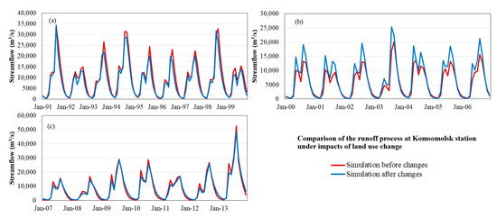 Comparison of the runoff process at Komsomolsk station under the impacts of land-use change: (a) 1991–1999, (b) 2000–2006, and (c) 2007–2013.
