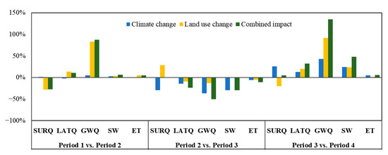 The responses of five hydrological variables in the ARB, including the surface runoff, groundwater flow, soil water, lateral flow and evapotranspiration, under climate and land-use changes are provided in Figure 13. The impacts of climate change and human activities on these five hydrological variables differed greatly, and the largest fluctuations occurred in the groundwater flow. Land-use changes provided a greater contribution to groundwater flow than did climate variability, and the impacts of land-use changes reached 91.84% after 2007 (based on a comparison between Period 3 and Period 4).