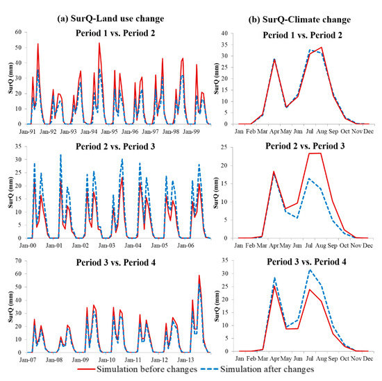 Comparison of the surface runoff in the ARB under different simulation scenarios: (a) Surface runoff under the impacts of climate change, (b) surface runoff under the impacts of land-use change.
