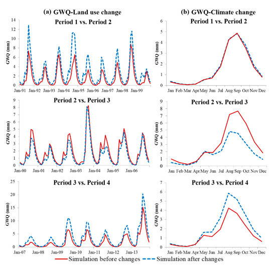 The key to this study was identifying the different magnitudes and directions of the impacts of climate variability and land-use changes on the hydrological variables over the last several decades and further assessing the relationships between the individual climatic factors/land-use types and the hydrologic components. To identify the variations in the impacts, the authors divided the simulation periods according to the historical land-use changes reported in the literature mentioned in the study area section [17,18,24,27,29,49] and the characteristic analytical results of the climate and land-use changes.
