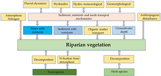 Riparian vegetation plays a significant role in the ecological balance of a riparian area [1]. Riparian area is a transitional semiterrestrial zone extending from the edges of water bodies to the edges of upland communities and regularly interacts with river water, flow alterations, sediment, and nutrients [2,3,4]. Flood disturbance is one of the major causes of vegetation mortality in the riparian zone either by inundation or bank erosion [5,6,7]. The morphological alterations in riparian area caused by a flood event either supports or suppresses the riparian vegetation, which depends also on the sediment grain sizes deposited on the original sediment surface or exposed of previous underlying sediment surface [8]. The flood hydrology affects the hydrochory in the riparian area during flood time, recruits seeds, and begins colonization of trees [9]. Water is one of the major principal seed dispersal agents in the floodplain [10]. The number of seeds floating during a flood event, magnitude of the flood, duration and frequency of flood occurrence determine the seed recruitment phenomenon in the riparian area [11,12,13]. The area of vegetation coverage in the riparian zone is directly dependent on the availability of water, nutrients available in water and sediment before and after the flood event, and exchange of nutrients from atmosphere to the floodplain [8].