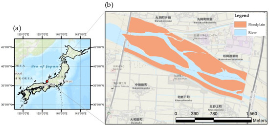 Location map of (a) Kuzuryu River study reach and (b) Magnified view of the study river reach floodplain.