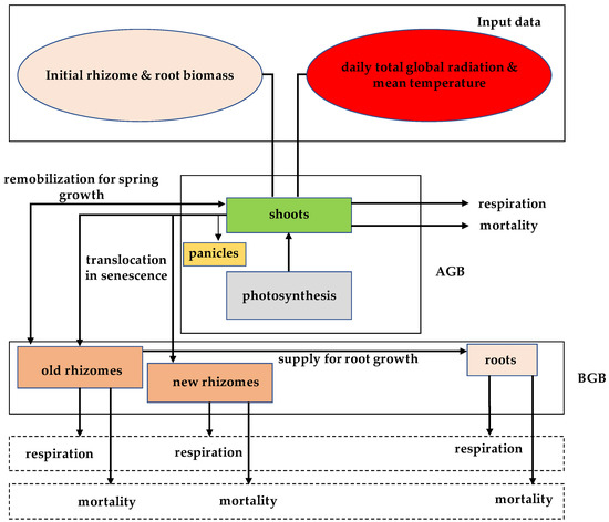 In this Dynamic Herbaceous Model, meteorological data such as daily temperature and daily solar radiation are the input parameters (Figure 3). In the case of lacking meteorological data, the latitude of the study site is considered as input for calculating the temperatures and solar radiation. The model consists of five different equations for shoots, inflorescence, roots, old rhizomes, and new rhizomes [5,44]. The initial rhizome and root biomass are also given as input variables for initiation of growth. The net growth of the whole plant is the combined effect of photosynthesis, respiration, mortality and transfer of assimilated materials.