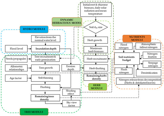 Figure 4 shows the schematic diagram of DRIPVEM coupled with a Dynamic Herbaceous Model. The model consists of HYDRO, TREE, HERB, and NUTRIENTS modules with their interactive roles [8,9]. The HYDRO module is used to link up flood hydrology to TREE and HERB modules which occurred in the floodplain. The flushing effects of flood is also considered in the model. The TREE module calculates the spatial tree distribution in the floodplain by considering initial colonization after flooding. The allometric relations with diameter at breast height (DBH) and age were also included in the model to predict the biomass growth of tree species such as Salix gilgiana, Robinia pseudoacacia, and Albizia julibrissin [8,9,47]. The HERB module calculates the herbaceous plants biomass with its spatial distribution in the floodplain in which particle size, shading effects of tree canopy, as well as the nutrient interactions and effects of floods are incorporated in the model. The NUTRIENTS module depicts the soil nutrients budget by interacting atmospheric nitrogen, flood nitrogen, nitrogen release after decomposition of litter biomass, and the N- fixation process of rhizobium bacteria with soil in the floodplain. The outputs of DRIPVEM were validated for Japanese steep rivers [35].