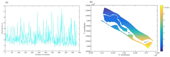 The historical monthly maximum flood levels (1969–2014) in Kuzuryu River study reach is shown in Figure 5a (http://www1.river.go.jp/). The riparian area is divided into 10 × 10 m meshes having elevations ranges from 0 (normal water level) to 7.33 m. The upstream riparian zone consists of the highest elevations and more than 50% riparian area composed of low elevations from 0.1 to 3 m (Figure 5b).