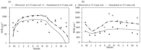 The monthly mean observed AGB and BGB of P. japonica on the floodplain in sandy habitat is higher than gravelly habitat (Figure 6a,b). The morphology of this plant such as plant density and height of plant are higher in sandy soil compared to gravelly soil. Flood disturbance and sediment interaction in the riparian zone alter the morphological conditions of the riparian zone such that the vegetation growth changes in the floodplain. The monthly mean observed AGB was significantly higher than at the gravelly site (two sample t-test, p < 0.05). Similarly, the monthly mean observed BGB at sandy sites was significantly higher than at the gravelly site (two sample t-test, p < 0.05). The observed maximum AGB was 1406 gm−2 at 0.13 mm sediment grain size (sandy site) whereas its value was 400 gm−2 at 15.2 mm sediment grain size (gravelly site). Similarly, the observed BGB was 1147 gm−2 in the sandy site and 808 gm−2 in the gravelly site respectively. The AGB is easily removed subject to floods and thereafter the photosynthesis is curtailed throughout the remaining growth periods of the year, although the secondary shoots grow if the flood occurs early in the growing season [48,49]. The Dynamic Herbaceous Model predicted that the maximum AGBs were 1347 gm−2 at the sandy site and 462 gm−2 at the gravelly site. Similarly, the model predicted the maximum BGBs were 853 gm−2 at the sandy site and 541 gm−2 at the gravelly site. The comparison of observed and simulated AGB (R2 = 0.92) and BGB (R2 = 0.85) at sandy soil and AGB (R2 = 0.51) and BGB (R2 = 0.66) at gravelly soil (Kumagaye, Japan) are shown in Figure 6a,b.