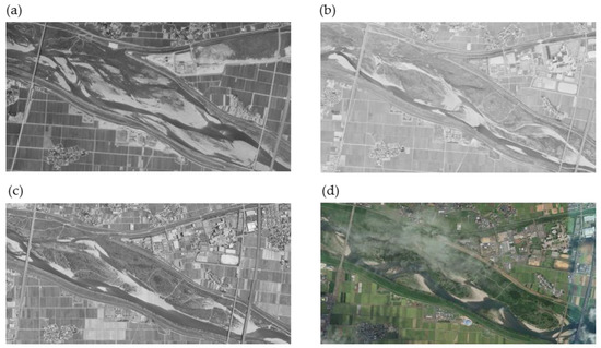 Historical aerial images in chronological sequence illustrating vegetation growth in Kuzuryu River, Japan: (a) 1982, (b) 1994, (c) 2004, (d) 2018 (Source: Geographical Information Authority of Japan https://mapps.gsi.go.jp/maplibSearch.do#1 and Google Earth 2018).