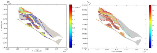 Figure 9a shows the simulated density wise spatial distribution of trees on the floodplain after 49 years of simulation in the sandy site. The density wise distribution of trees varied from 0.02 to 0.53 Nos. m−2 consisting of different ages of trees varying from 1 to 18 years old (Figure 9b). Out of 8639 meshes, 7217 meshes are covered with trees in 2018 and the DRIPVEM calculated 4224 meshes were covered with trees (R2 = 0.65). The discrepancies were expected due to the external factors, for example hydraulic factors, temperature, and environmental factors change after flood events.