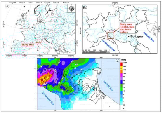 Location map of the study area (a,b) and the cumulative rainfall (c) from 23:00 local time on 13 September to 05:00 on 14 September, on the major catchment areas of the Emilia-Romagna Region. According to the rainfall data recorded in the meteorological stations of the ARPAE-SIMC regional network.