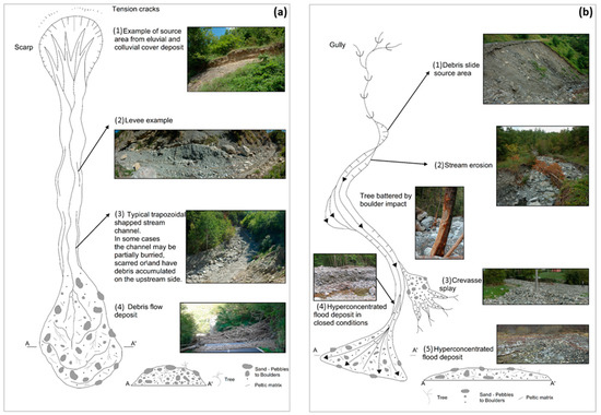 (a) Model of hillslope-debris flow derived from the geomorphological mapping where the typical landforms of source area (1), levees (2), channel (3) and deposit (4) are shown. (b) Field-work- based model of a hyperconcentrated flow in which the source area (1), stream erosion (2), crevasse splay (3), and deposits, both in open (4) and confined (5) condition, are shown.