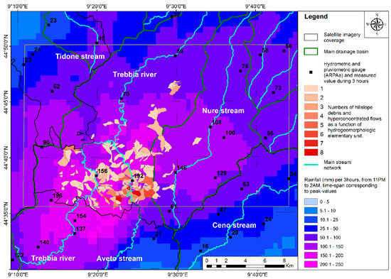 Within each of the 286 HEUs mapped in the study area, the average rainfall recorded in the three hour time-span and the average acclivity of the microbasin, the latter playing a major role in driving mass flows [29], were calculated. The results were then matched with the number of high-discharge and hillslope-debris flows, recorded within each microbasin (Figure 5a).