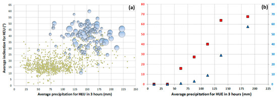 (a) Number of ground effects recognized in hydrogeomorphologic elementary units (HEUs), plotted with rainfall intensity (mm/3 h) and HEUs mean slope steepness. Yellow dots correspond to (HEUs) without flow processes, gray-shaded circles are the HEUs that were interested by flow processes, the size of circles is proportional to the number of processes, from a minimum of 1 (smallest circles) to a maximum of 8 (largest circles). (b) Only HEUs with average acclivity of more than 25° are reported. The figure shows the relationship between the percentage of mass flows triggered per HEU (red square), and the number of HEUs where mass-flows were recorded (blue triangle) in relation to average precipitation for HEU in 3 h.